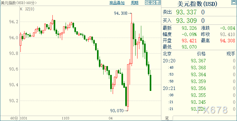 但美指盘中先后刷新一周低位至93.070和9月28日以来高位至94.308;金价创下近两周新高至1916.56美元/盎司后一度挫跌逾1.7%。