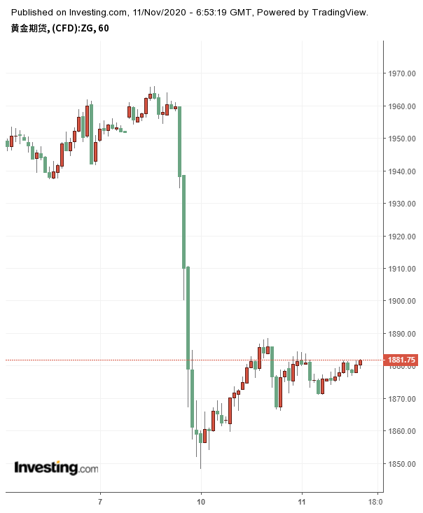 因此,虽然拜登警告称人们对于新冠治疗方案或疫苗的情绪过于乐观,但黄金期货周一仍然最深下跌了100美元/盎司,为8月份以来最大单日跌幅,同时股票、石油等其他所有风险资产上涨。