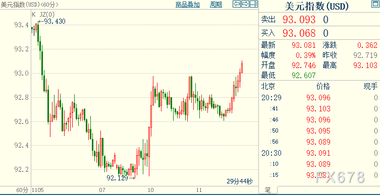 现货黄金下跌0.28%至1871.93美元/盎司;COMEX期金主力合约下跌0.34%至1869.0美元/盎司;美元指数上涨0.32%至93.089。
