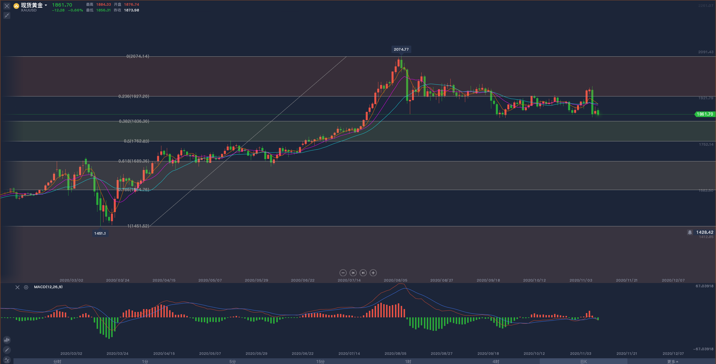 第二,反弹做空,现在1861的点位并不适合进场,首先防守点位不好带,利润空间也只到前低附近。所以等黄金价格反弹至1870附近,可分批建仓空单。