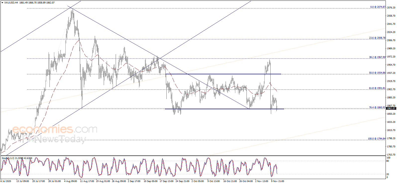 Economies.com补充道,倘若金价跌破1860.90美元/盎司,这将止住预期中升势,并推动金价进一步下滑。
