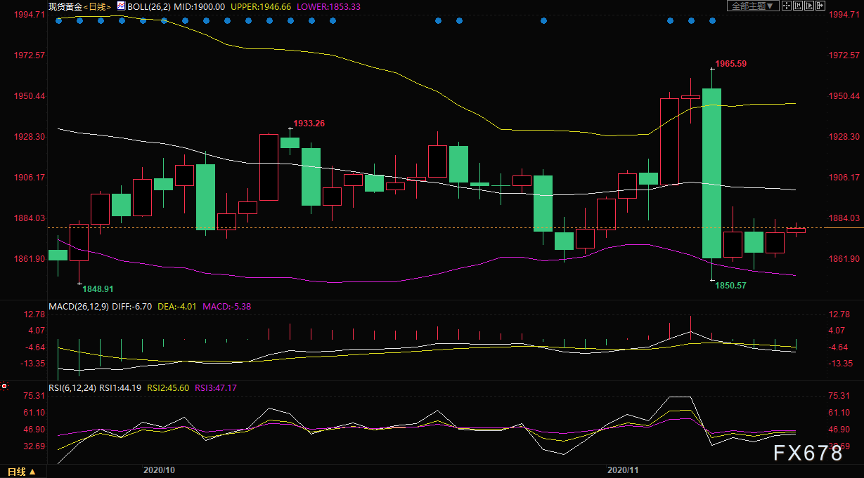 周五(北京时间11月13日)亚盘时间段,现货黄金小幅走高,现报1879.80美元/盎司,涨幅约0.16%,因新冠确诊病例仍在快速增加的影响,美国经济各项数据显示经济趋于疲软,经济下行压力较大,分析师们也都表态对经济前景不太乐观,黄金的避险属性或将得到提振。另外,技术上,现货黄金1850点位提供了强支撑,短线金价有望再次上探1900关口附近阻力。