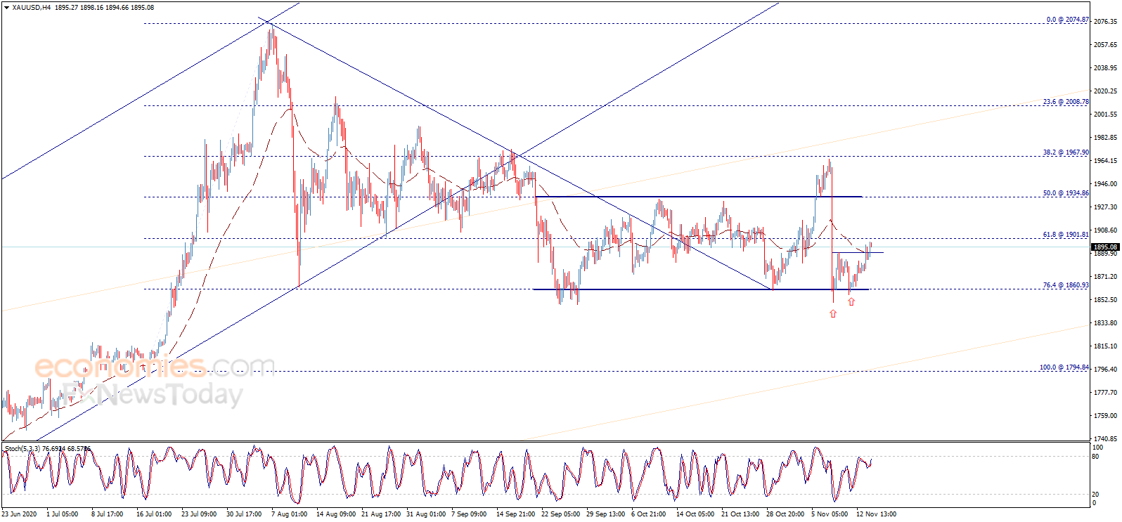 Economies.com在文章中写道,金价今日交易开始后进一步上涨,并接近等待已久的目标价位1901.80美元/盎司。通过仔细观察图表,我们发现金价完成双底形态的构建,我们正等待这一因素推动金价突破上述水平,从而为金价在未来几个交易日继续上涨打开道路,下一目标指向1934.86美元/盎司。