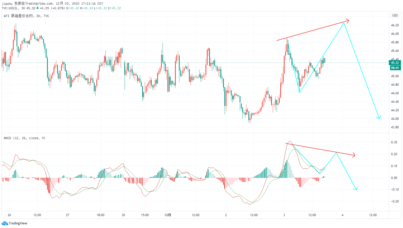 原油隔夜走势也很精彩,有涨有跌,而且难能可贵的是原油的形态并没有被破坏,4小时级别MACD快慢线在0轴上方金叉,日线级别MACD快慢线还没死叉,仍给4小时完成筑顶形态留下了一定的空间和时间,所以原油的观点不变,出现46.2上方新高之后进场布局空单!