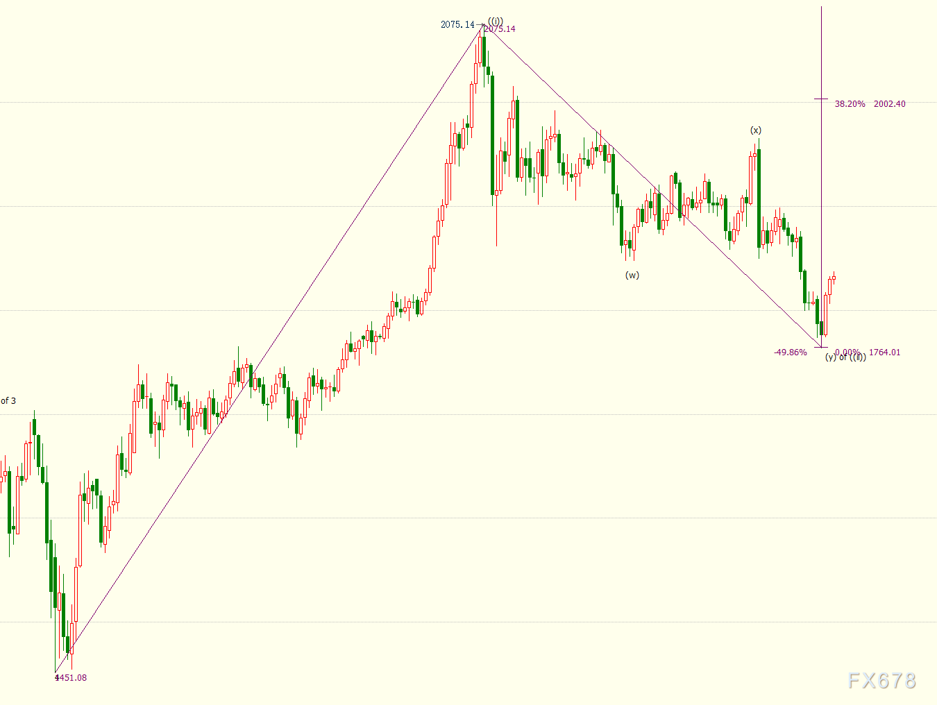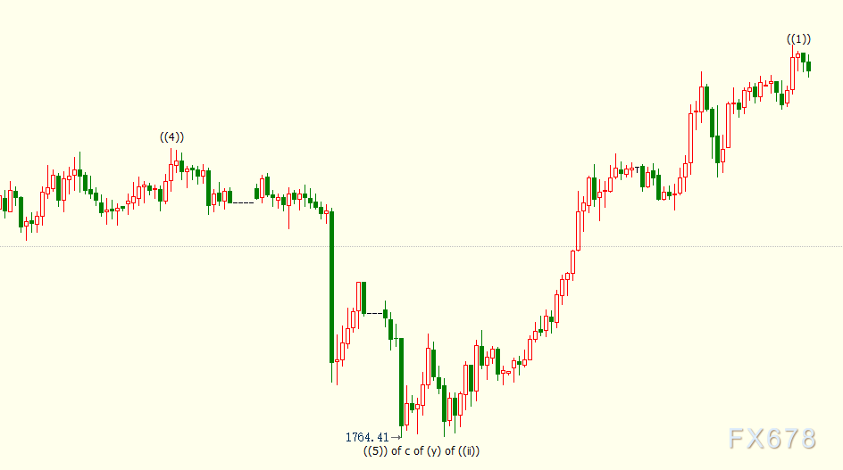 日线图上看,金价自1764美元开启上行((iii))浪走势。((iii))浪料细分为(i)、(ii)、(iii)、(iv)、(v)浪,i浪是(i)浪的子浪。((iii))浪则是自1451美元开启的上行5浪的子浪。((iii))浪的14.6%目标位在1855美元。