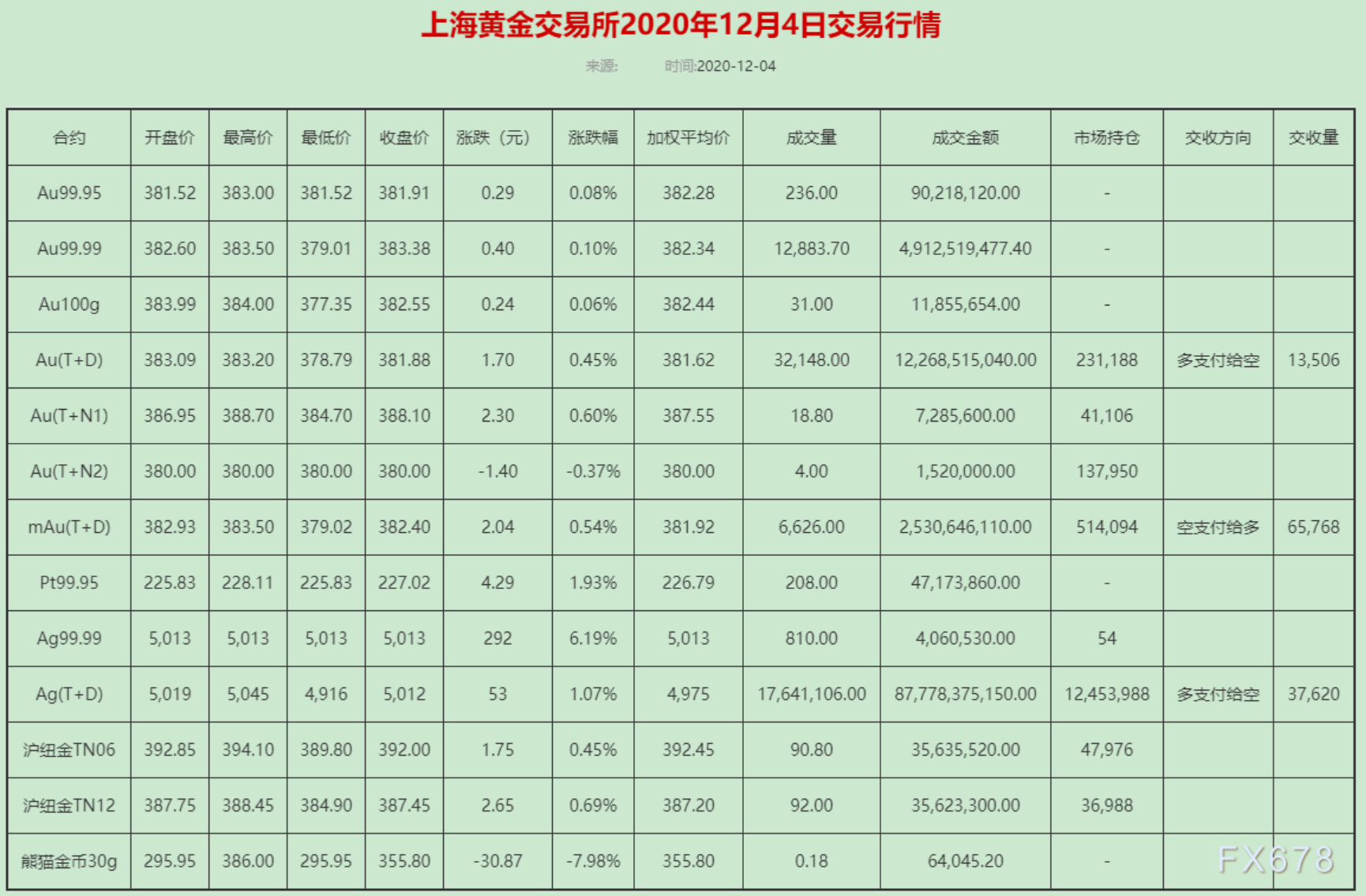 上海黄金交易所2020年12月4日交易行情,黄金T+D成交量32.148吨;