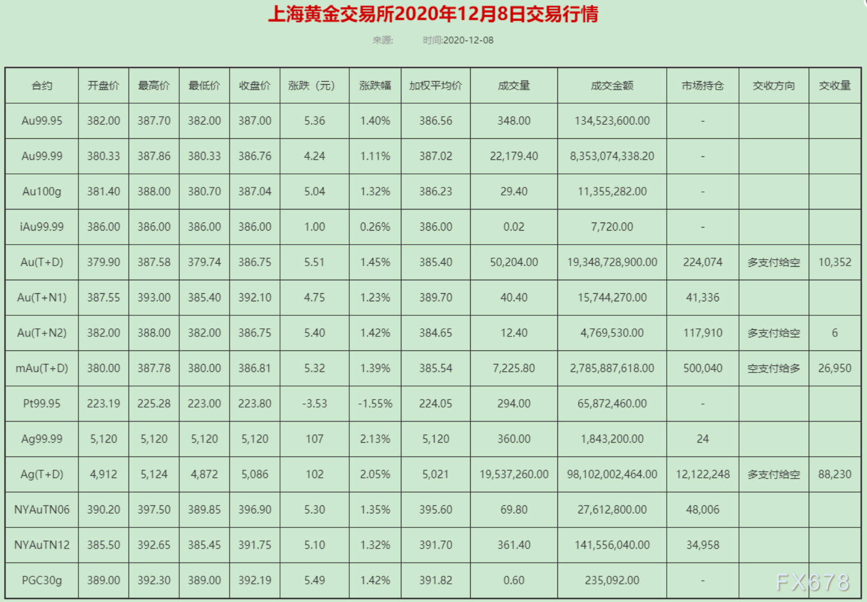 上海黄金交易所2020年12月8日交易行情,黄金T+D成交量50.204吨;
