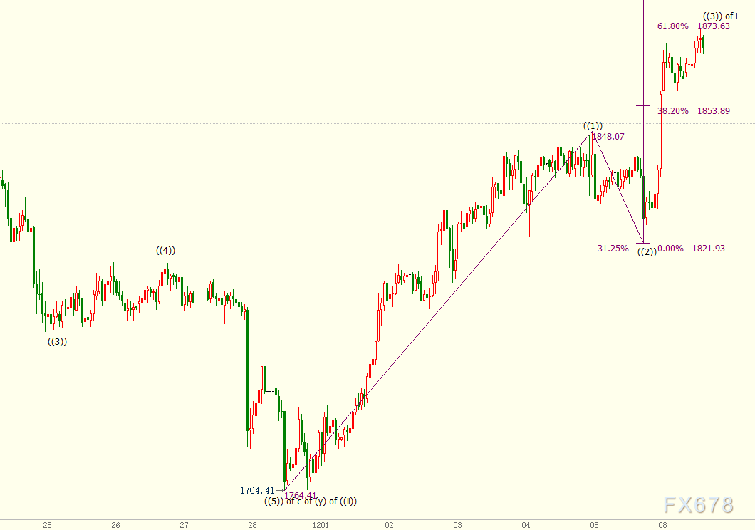 现货黄金处于自1822美元开启的((3))浪,并且逼近61.8%目标位1874美元,76.4%目标位看向1886美元。((3))浪是自1764美元开启的上行i浪的子浪。i浪是同样从1764美元开启的上行(i)浪的子浪。