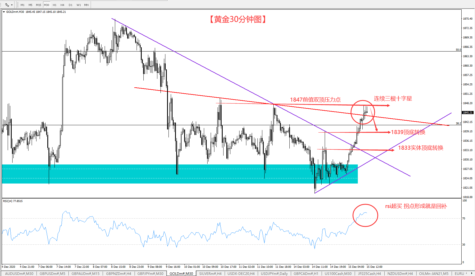 但是,在最近的两个小时当中,黄金接连在1847碰壁,并且接连出现十字星K线,RSI也触及到了80%,明显要出现一段反转的趋势,所以说,即使是出现这种震荡上行,也不要着急去追,需要看待一段回撤行情再说,还有就是,我们中期做空的点还没到,等待一波1857-1875高点去空他不香吗?何必做这种提心吊胆的交易呢?