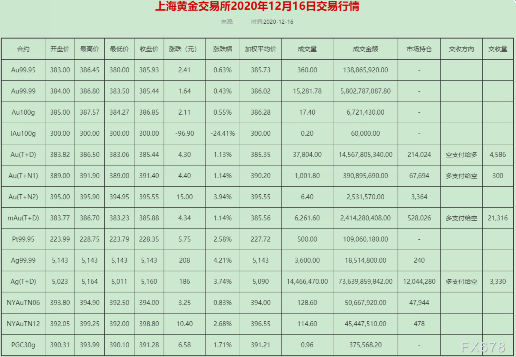 上海黄金交易所2020年12月16日交易行情,黄金T+D成交量37.804吨;