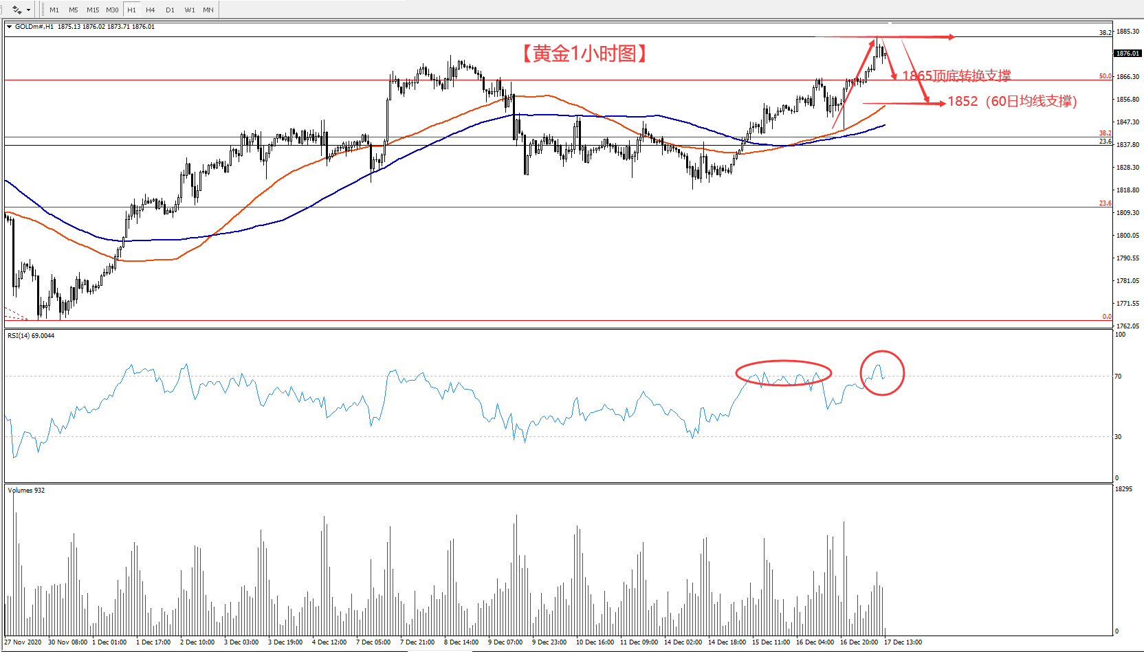 就拿黄金上周从1875跌下那一波来看,rsi触及到70%之后,直接发生反转,最低抛售至1824,而且成交量也是跟现在一样开始扩大。所以本次也是相同的原理,在结合着从2075-1764的斐波那契来看,1883正属于38.2%回撤点,自1965-1764的斐波那契61.8的回撤点位于1888,基本等于重合,加上日线结构60日均线1875的压制,三重压力面前,如果金价延续上行,那么基本上空头也就宣告结束。