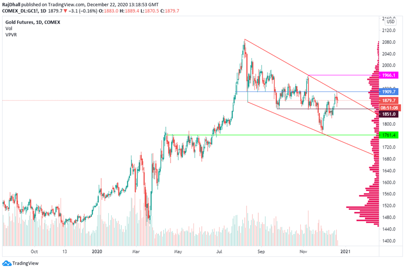 有一些关键的上涨点位需要关注。首先是当前的高点1909.7美元/盎司,另一个高于1966.1美元/盎司。