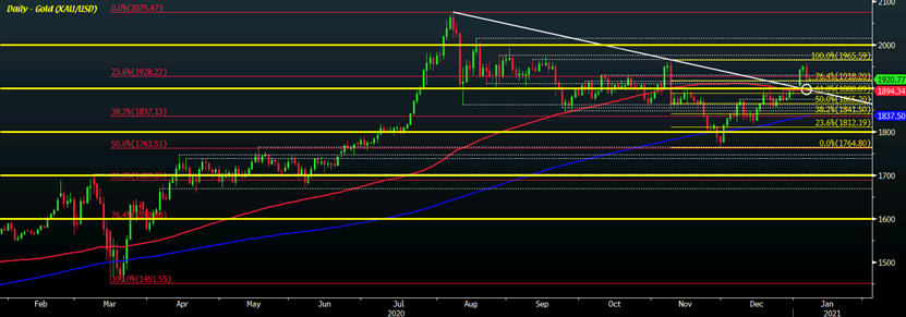 尽管市场关注的是通货再膨胀交易,但黄金价格在昨日交易中有所回落,从11月初接近1960-65美元高点的水平下跌至1900.88美元。