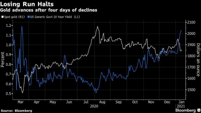 美元从近三年低点反弹,再加上10年期美国国债收益率飙升,近几日令无息黄金承压。不过,美国当选总统拜登将于周四公布数万亿美元的刺激计划,这可能有助于为通胀上升铺平道路,黄金被视为对抗通胀的一种对冲手段。