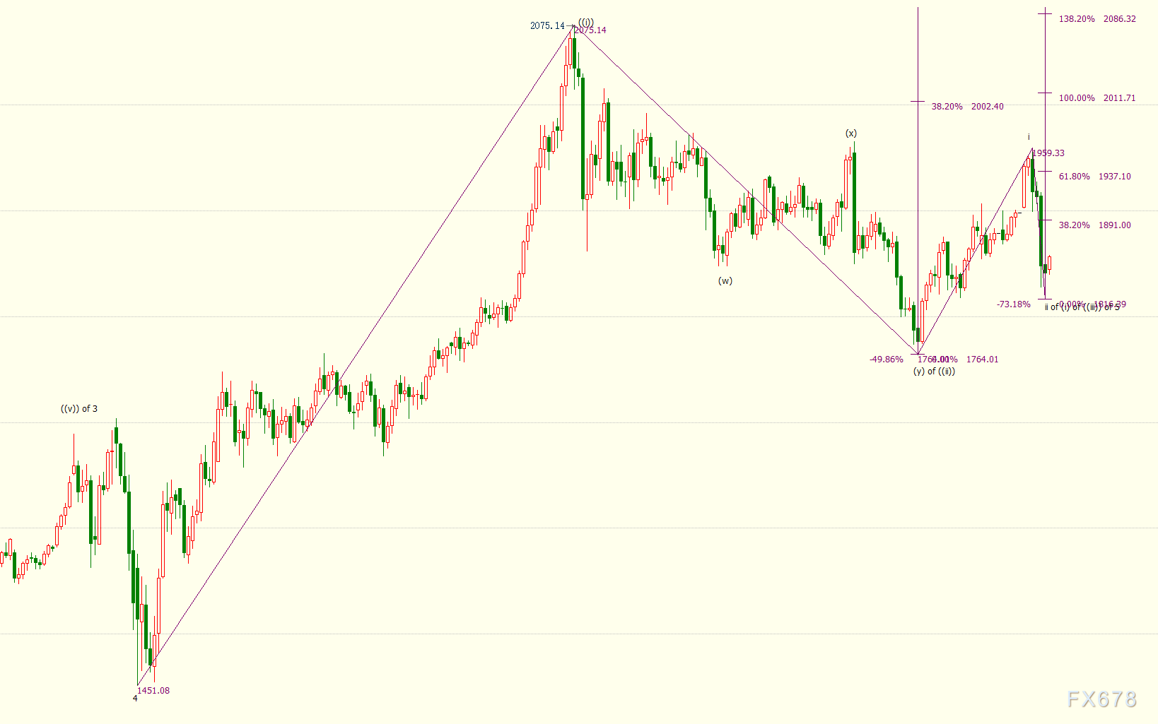 日线图上看,金价自1764美元开启上行((iii))浪走势,(i)浪是((iii))浪的三级子浪。((iii))浪的38.2%目标位在2002美元,((iii))浪是自1451美元开启的上行5浪的子浪。
