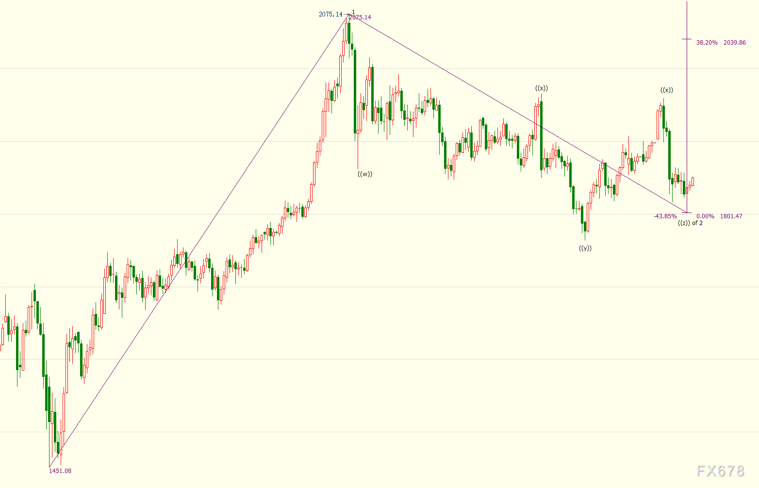 日线图上看,2浪呈现三重三锯齿形结构,可细分为((w))((x))((y))((x))((z))五子浪。若金价自1801美元开启上行3浪走势,上方阻力位看向23.6%目标位1949美元。自此之前将面临1900美元重要关口压力。