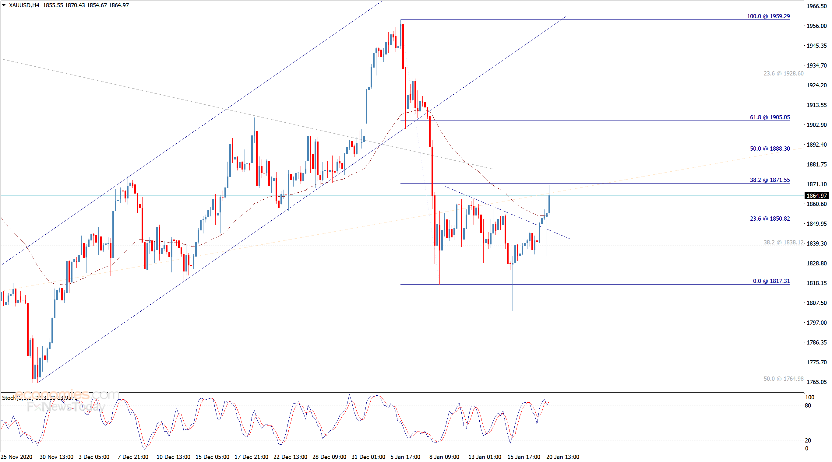 Economies.com在文章中写道,金价周三盘中成功触及我们首个等待的看涨目标1871.55美元/盎司。