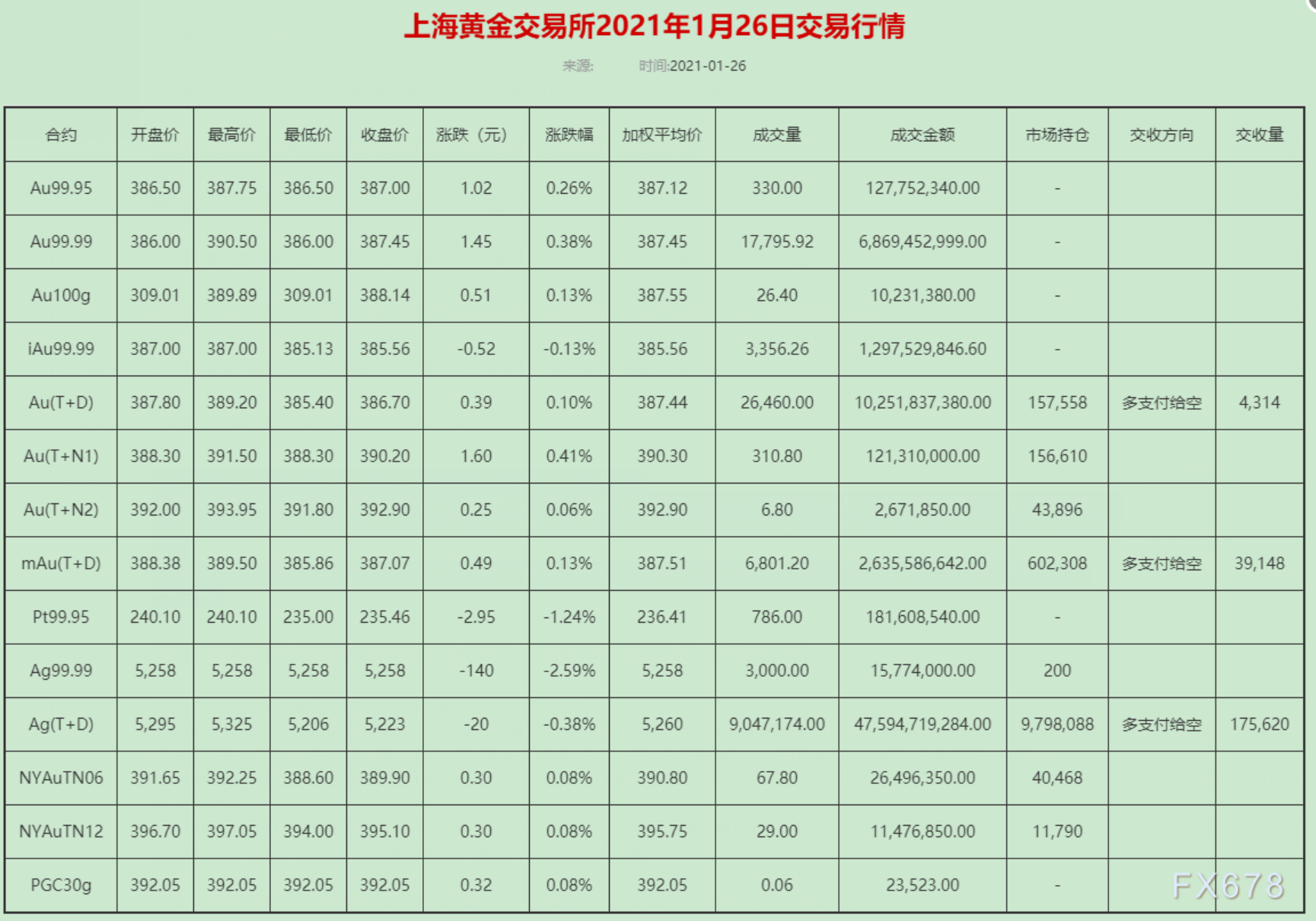 上海黄金交易所2021年1月26日交易行情,黄金T+D成交量26.46吨;