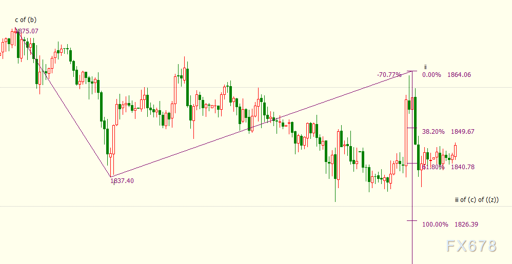 小时图上看,金价自1837美元开启的调整ii浪走势出现延伸。若金价在1864美元结束ii浪,并开启下行iii浪走势,那么金价在iii浪61.8%目标位1841美元暂获支撑,100%目标位在1826美元。ii浪和iii浪都是自1875美元开启的下行(c)浪的子浪。(c)浪的38.2%目标位在1815美元。