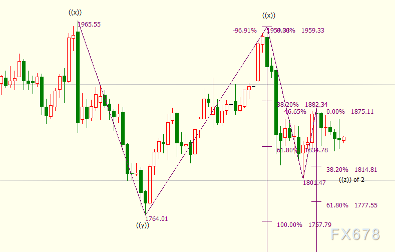 日线图上看,(c)浪是自1959美元开启的下行((z))浪的子浪,(c)浪的61.8%目标位在1778美元。((z))浪则隶属于自2075美元开启的调整2浪。2浪呈现三重三锯齿形结构,可细分为((w))((x))((y))((x))((z))五子浪。