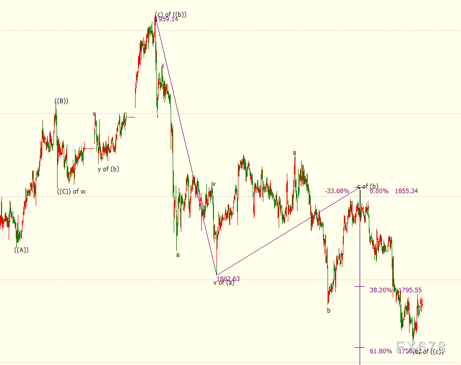 小时图上看,现货黄金处于自1855美元开启的下行(c)浪中,并在其61.8%目标位1759美元上方附近暂获支撑,下一道支撑位看向76.4%目标位1736美元。(c)浪是自1959美元开启的下行((c))浪的子浪。