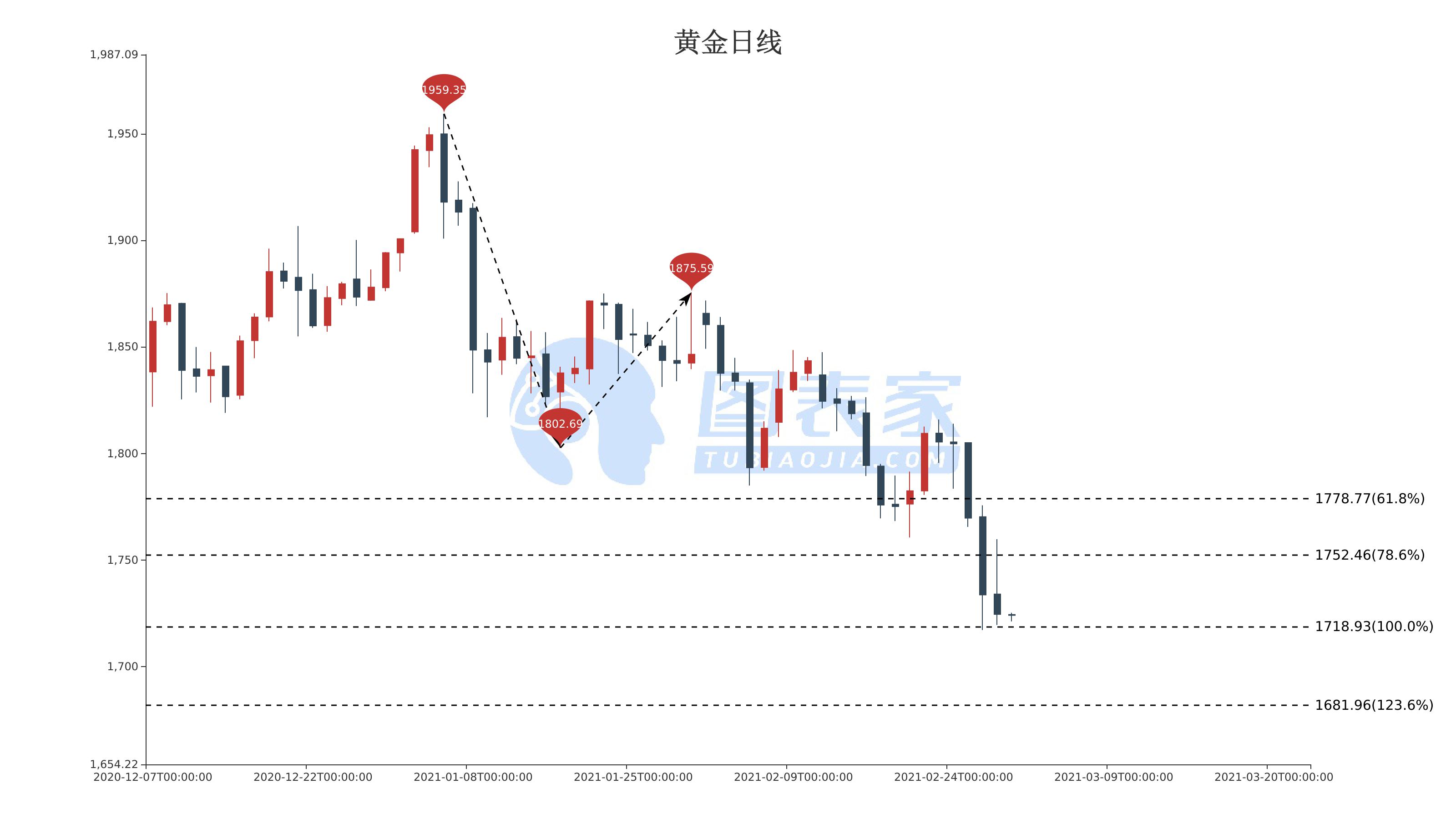 若价格上行,上方较近阻力位为1752.46,突破后或将测试斐波那契61.8%延展位1778.77阻力。
