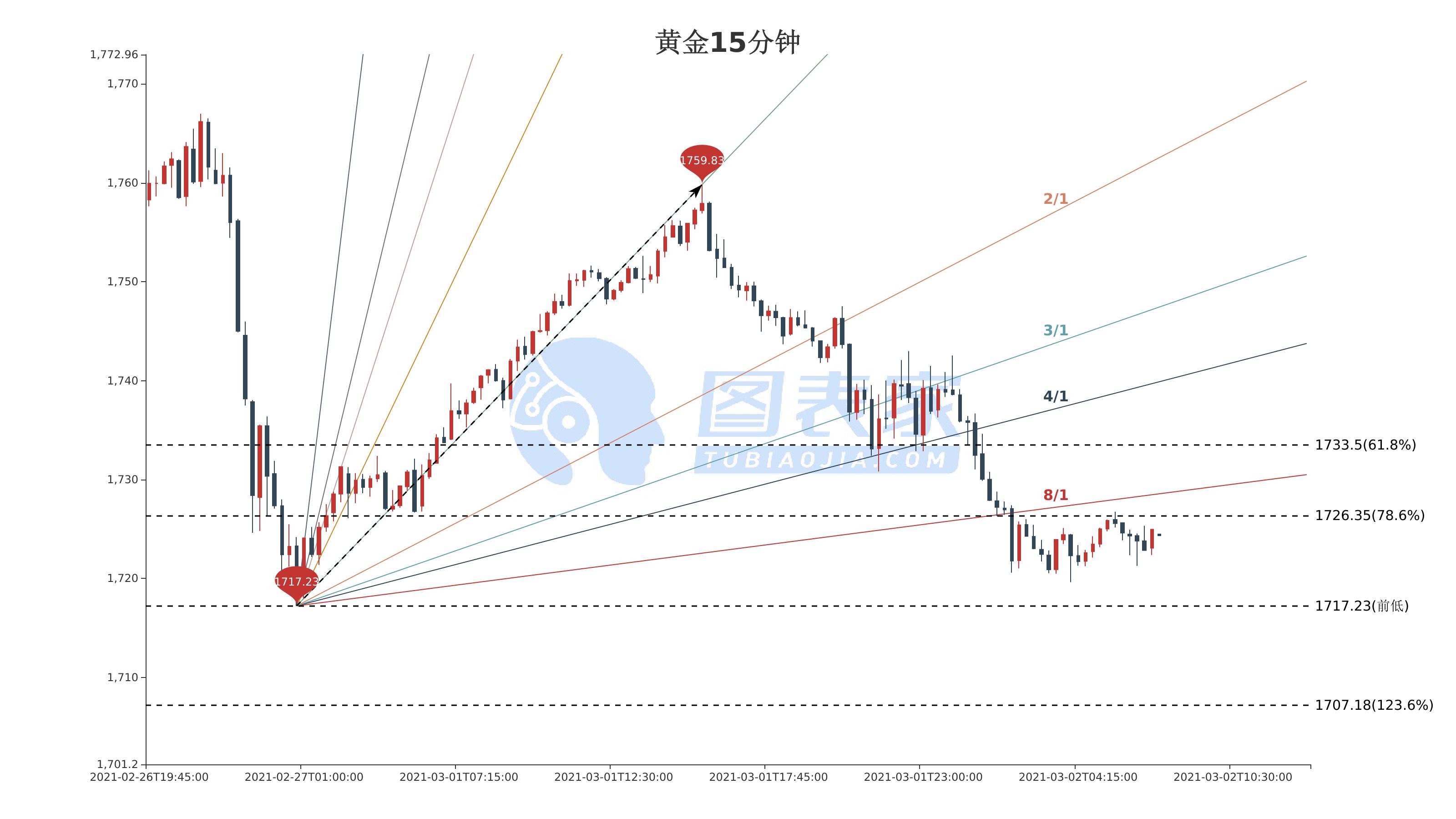 图为黄金15分钟走势图,价格短线走低,且正交投于斐波那契78.6%回调位1726.35下方,若价格持续下行,短线或测试前低1717.23支撑,跌破后后市或将进一步看跌至斐波那契123.6%延展位1707.18。