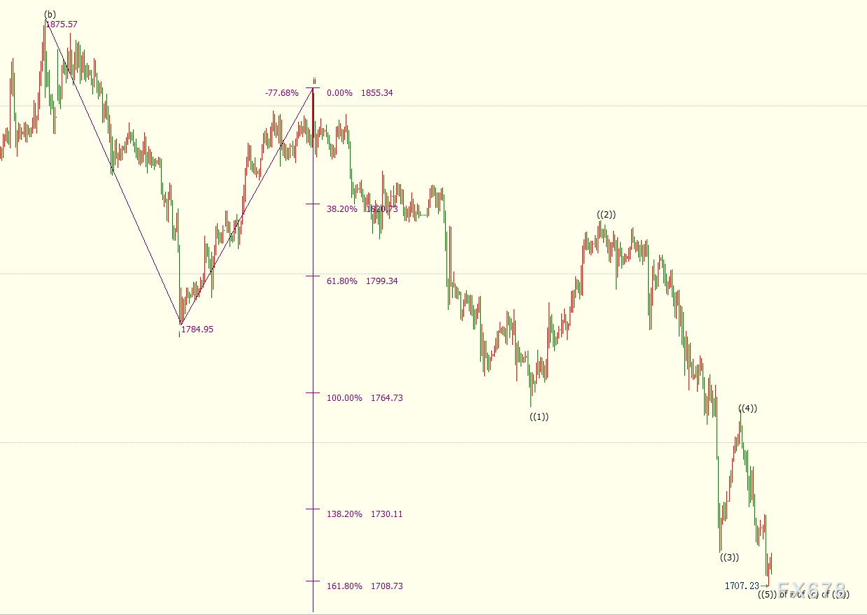 日线上看,(c)浪是自1959美元开启的下行((z))浪的子浪。((z))隶属于自2075美元开启的4浪调整走势,4浪呈现((w))((x))((y))((x))((z))三重“之”字调整模式。((z))浪已跌破123.6%目标位1710美元,下方支撑看向138.2%目标位1681美元。