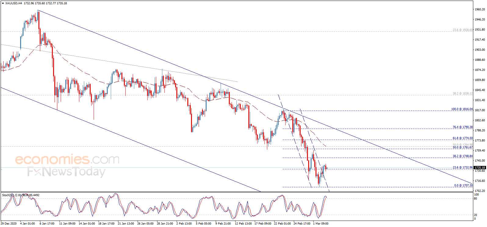 Economies.com预计,今日金价交投将位于支撑位1715.00美元/盎司以及阻力位1750.00美元/盎司之间。