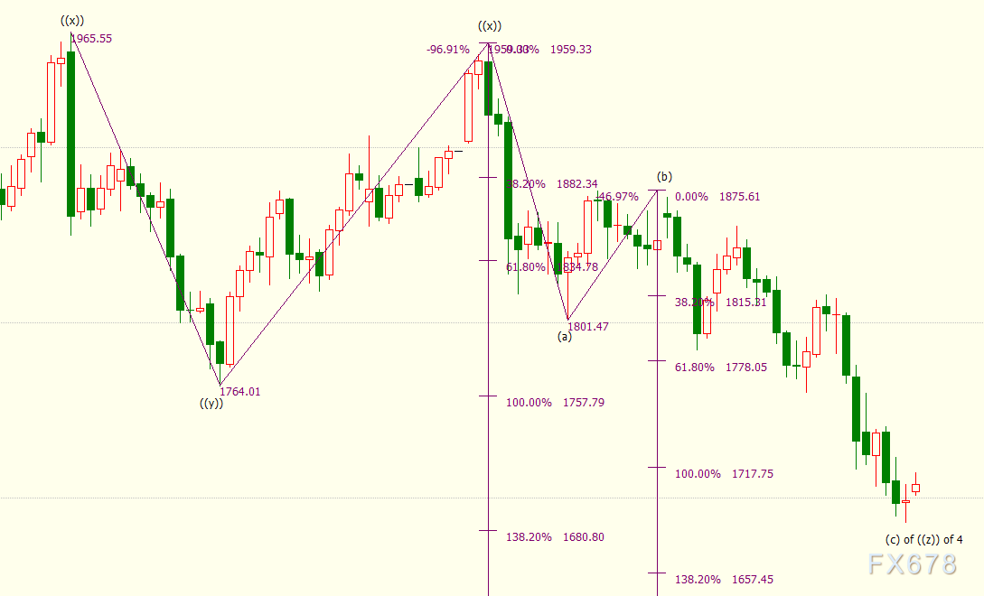日线上看,(c)浪是自1959美元开启的下行((z))浪的子浪。((z))隶属于自2075美元开启的4浪调整走势,4浪呈现((w))((x))((y))((x))((z))三重“之”字调整模式。((z))浪料将138.2%目标位1681美元,并进一步下探150%目标位1657美元。