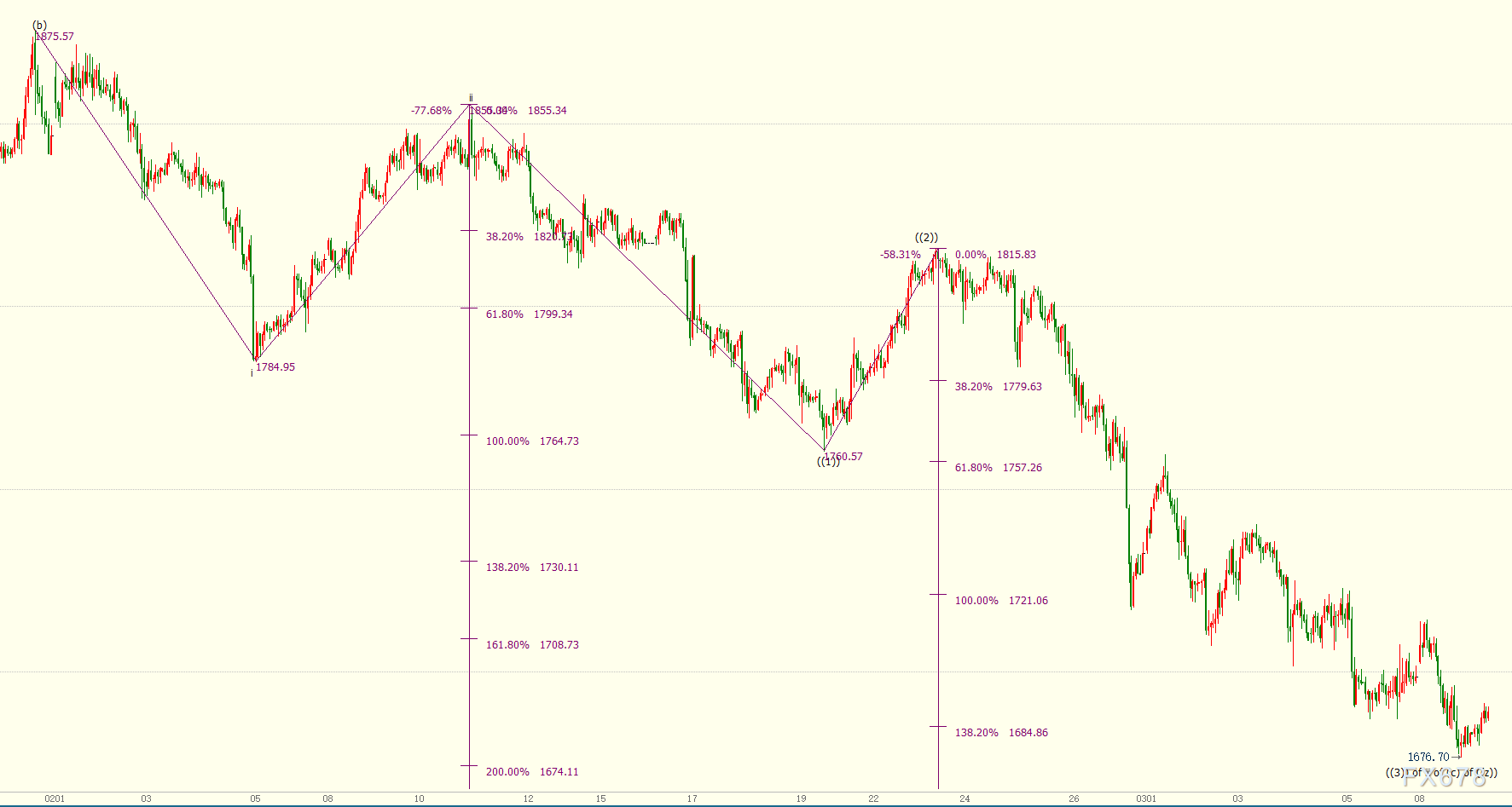 小时图上看,现货黄金处于自1816美元开启的下行((3))浪中,并跌破138.2%目标位1685美元,下一道支撑位看向161.8%目标位1662美元。((3))浪是自1855美元开启的下行iii浪的子浪,金价似乎在iii浪200%目标位1674美元上方附近受到支撑。