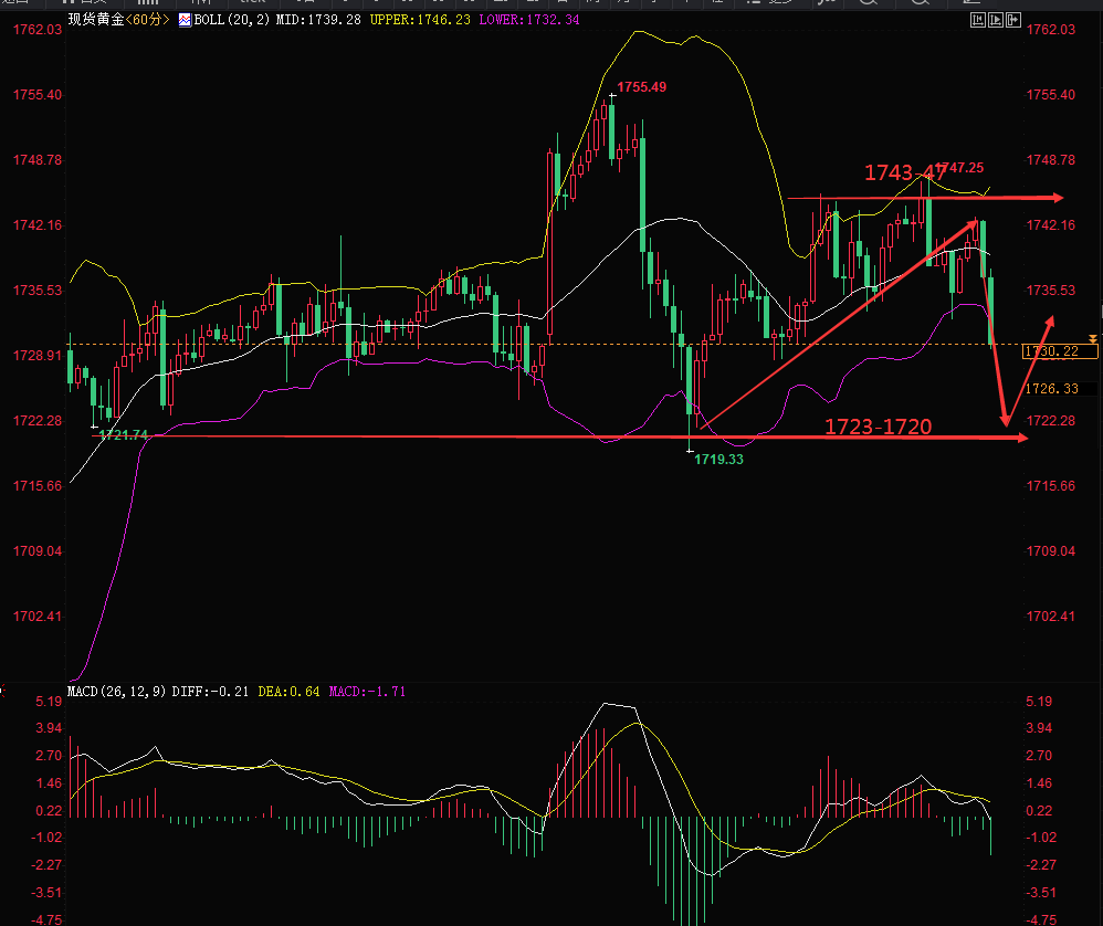 黄金上周未能乘势冲击1760而重新转为宽幅震荡走势,今天(3月22日)早盘我们在34位置挂的多单还没能进去,但也不是完全没有机会,如果没有就等到上方再做空。