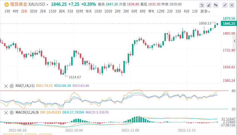 在日线图上,从2022年11月23日的低点1727.50美元/盎司到2022年12月27日的高点1832.99美元/盎司的缓慢上涨被认为是一个积累的过程。