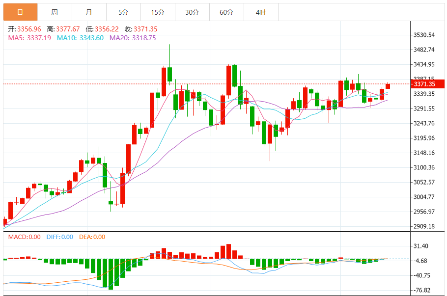 基本消息面 周三(6月11日)纽约尾盘,现货黄金涨0.86%,报3352.18美元/盎司,北京时间20:30发布美国CI通胀数据之后迅速呈现出短暂而尖锐的冲高回落行情,20:36刷新日高至3360.77美元,02:00再次快速拉升,使得CI数据发布后那一波涨幅在很大程度上得到恢复。COX黄金期货涨0.9%,报3373.50美元/盎司,也逼近20