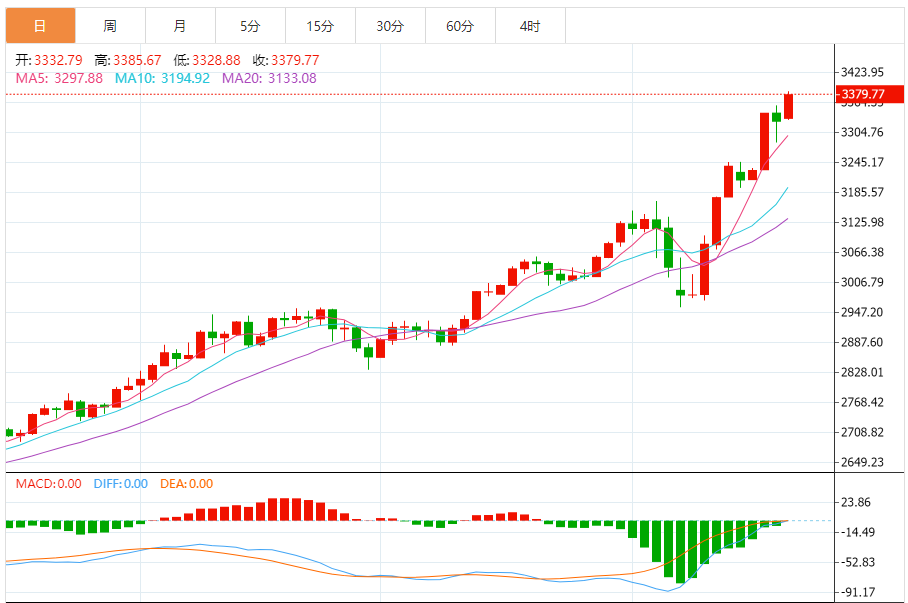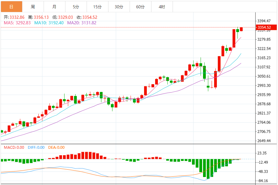 基本消息面 周一(4月21日),现货黄金现报3354.75美元/盎司。上周国际金价再度书写历史,现货黄金在突破3300美元心理关口后,一度飙升至3357.66美元/盎司的历史新高,收报3327.04美元/盎司,周线涨幅约2.76%。最新调查显示,尽管华尔街专家和aintrt散户对金价站上3300美元后渐显谨慎,但市场整体仍维持强劲看涨
