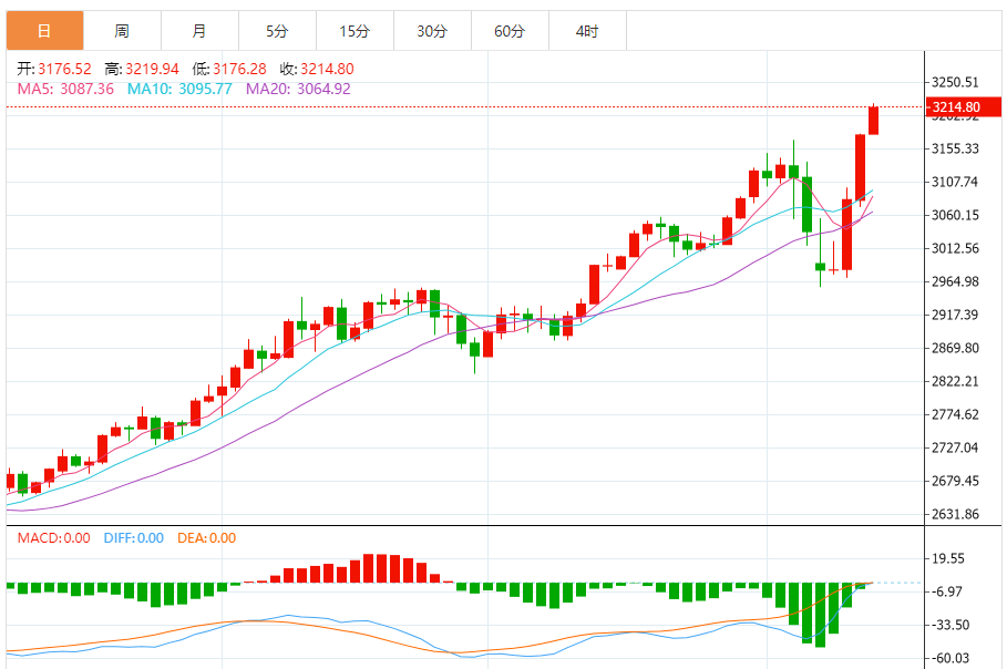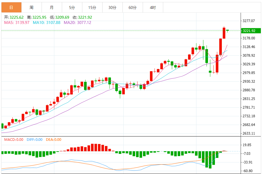 汇通财经APP讯——周五(4月11日),现货黄金价格在欧洲交易时段获得强劲上行动能,一度触及3237.66美元指数(DXY)在全线扩大跌势,目前已跌破99.90关口,创下三年来新低。市场对全球和美国经济前景的持续担忧,加剧了美元的抛售压力。美国3月通胀数据低于预期,进一步增强了市场对从120分钟图表分析,现货黄金自探底2956美元后,形成了一个清晰的上升通道,价格目前处于通道中上部区域。近期金价加速上行,突破3100美元心理关口后动能进一步增强。当前价格位于3220美元附近,已大幅超越各期移动平均线,其中MA55为3066.39美元,MA14为3177.64美元,MA200为3066.88美元,显示强劲的上行趋势。MACD指标显示DIFF(42.45)和DEA(38.71)持续扩大差距,MACD值为7.49,柱状体连续扩大,显示上行动能强劲。RSI指标处于70.25的位置,在超买区域但尚未出现背离信号。商品通道指数CCI(94.95)处于高位,但同样未出现明显顶背离,预示上行趋势仍然健康。从K线形态看,近期连续大阳线配合小幅回调,显示多头力量占据主导,特别是4月10日的长阳线突破前期高点后,11日再次创出新高,确认了突破的有效性。从日线图表看,现货黄金自今年年初开始形成稳定上升趋势,从2583.01美元持续攀升至目前的3220美元附近,涨幅超过24%。日线MA55(2951.76美