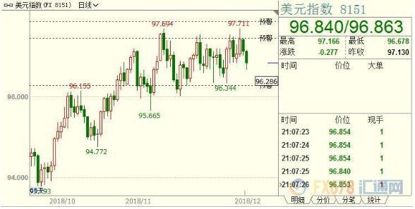 现货金价盘中创六个交易日新高至1250.44美元,上周一(12月10日)曾创下7月11日以来新高至1251.09美元;美元指数盘中刷新六个交易日低点至96.678,上周末曾改下2017年6月21日以来新高至97.711。