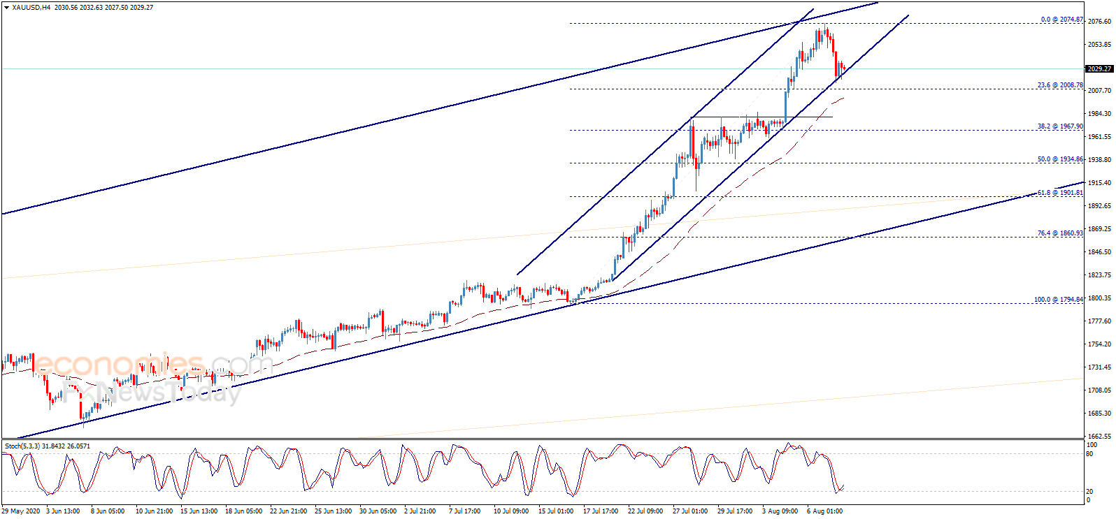 如图所示,金价一度触及看涨通道支撑线,目前位于这一水平附近。不过,随机指标开始传递正面信号,此外,EMA50指标继续对金价构成支撑。