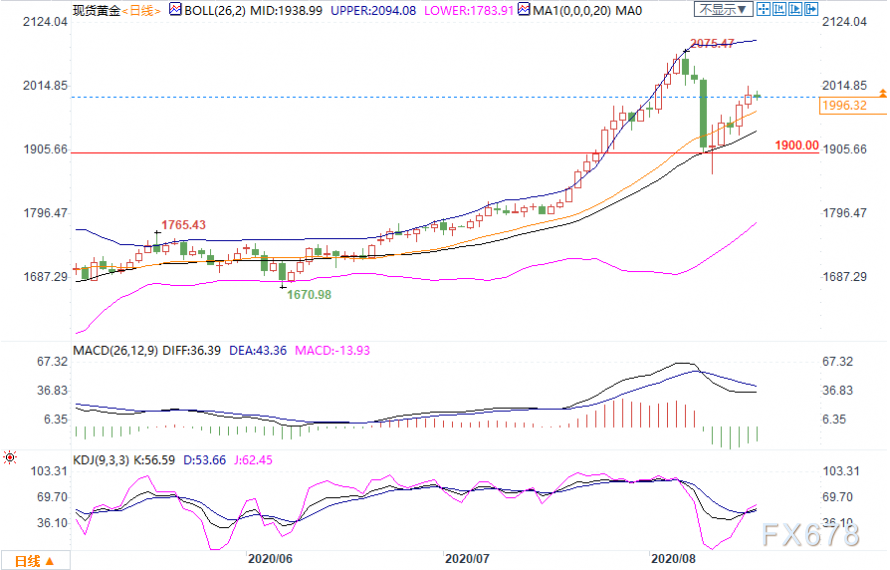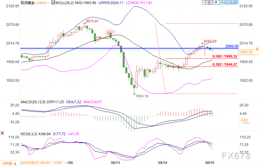 上行方面,先留意2000.00关口,;进一步阻力上看布林带上轨2020.13,这在8月上旬被多次测试。若上破,则关注8月10日高点2049.96;强阻力仍关注前高2075.47。
