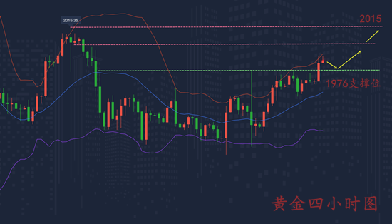 技术面上分析,从四小时各项指标来看,当前布林带呈开口期,布林线三轨走势平稳,K线于上轨附近运行,欲突破上轨继续上行,多头依旧占据优势,MA5日均线和MA10日均线结为金叉,KDJ随机指标三线高高扬起,且结成金叉,到达超买,MACD红色动能柱持续放量,快慢线一路高歌猛进。综合来看,黄金当前已经突破1980阻力位,目前走势比较明显,多头控盘,方向明确,回踩下方1975-1980区域附近直接做多,上方关注2000整数关口短期阻力,破位直接看2015!下方关注1976一线支撑。
