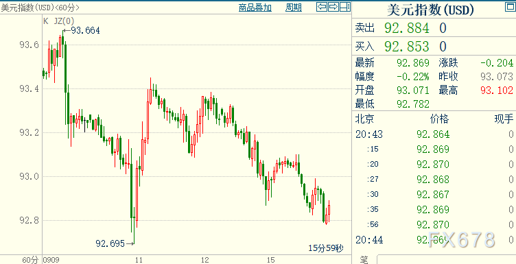 金价盘中触及9月2日以来新高至1972.27美元/盎司。美元指数进一步远离上周录得的8月12日以来最高位93.664。