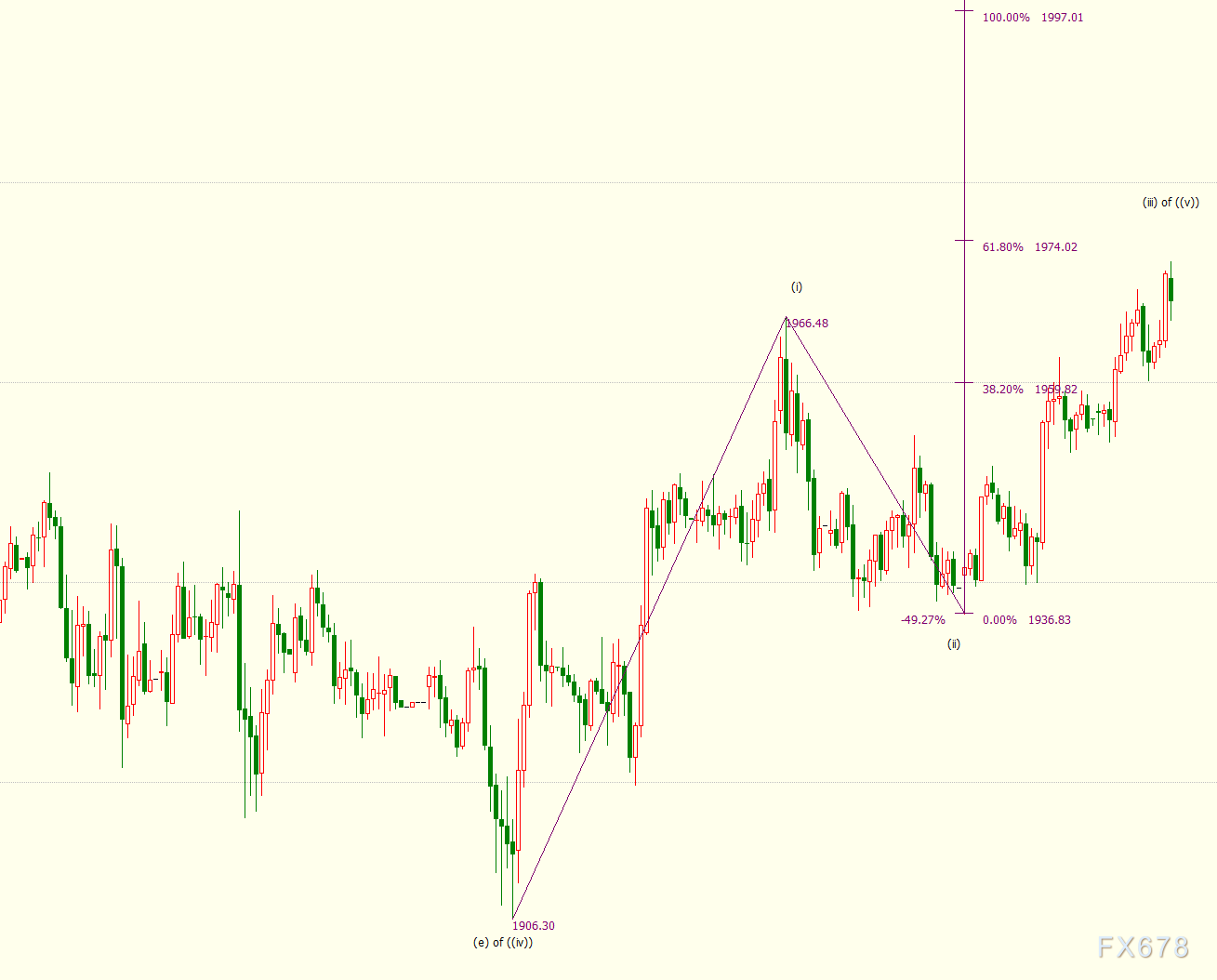 小时图上看,金价自1937美元开启动上行(iii)浪走势,目前已经逼近61.8%目标位1974美元,76.4%目标位1983美元。(iii)浪是自1906美元开启的上行((v))浪的子浪。
