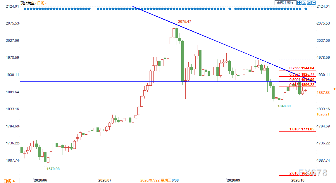 技术面上,黄金近期始终未能上破此前关键的压力区间1900-1920美元区间,同时上方下降趋势线依然压力明显。短时间上方关注9月16日高点和9月24日低点1973.56美元和1848.89美元的38.2%分位于1925.77美元,警惕短时间仍存在回调的空间。