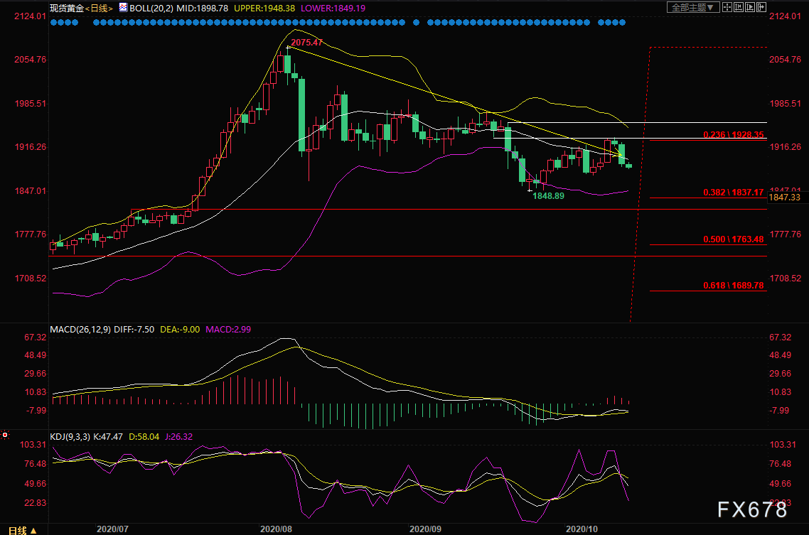 周三(10月14日)亚洲时段,现货黄金延续隔夜跌势,一度跌至1882.54美元/盎司附近,回吐了上周全部涨幅;周二因新冠疫苗的负面新闻打压股市,推动美元的避险,而且美国经济刺激方案磋商陷入僵局也驱动美元上涨,同时投资者也关注国际货币基金组织(IMF)小幅上调全球经济预估,也削弱了中长线投资者对黄金的资产配置需求,令金价承压失守1900关口;整体来看,金价中线下行风险显著增加。