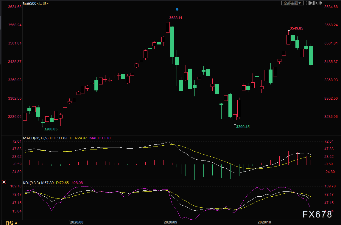 美国股市大幅收跌创逾一周新低,金价冲高回落,因新一轮援助计划或难以在大选前通过
