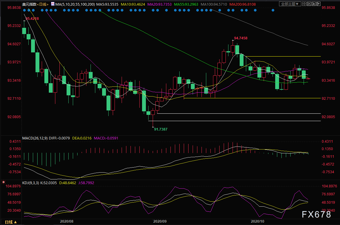 在新冠疫情在美国肆虐之际,近3000万美国人已提前对11月总统大选投票,创下历史纪录,民主党暂时领先;关键州佛罗里达州周一也为提前投票的选民开放了投票站。民调显示,拜登胜选的概率高达85%,这使得市场憧憬拜登胜选后将出台更大规模的刺激计划,美元指数周一大跌,一度失守55日均线,这给金价提供了一些支撑。