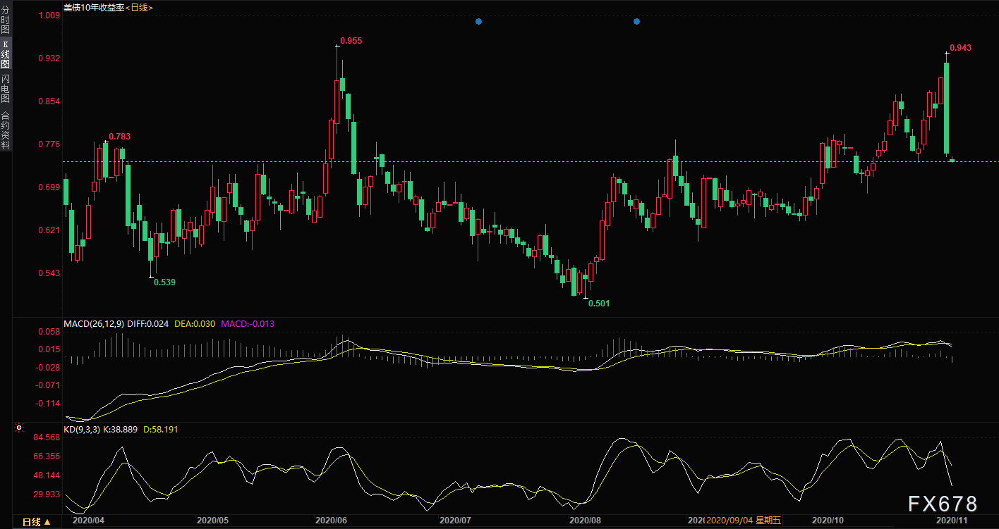 美国公债收益率大跌,此前尚未统计完成的大选结果显示国会仍处于分裂状态,且有可能出台规模较小的刺激计划。指标10年期公债收益率盘中一度低见0.754%,尾盘报0.762%,远低于海外市场短暂触及的五个月高位0.943%。