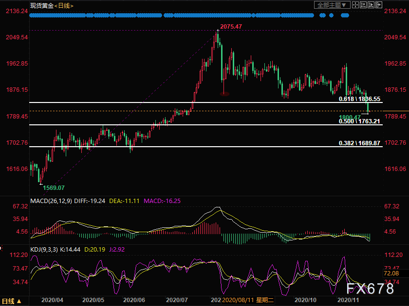 周三(11月25日)现货黄金低位徘徊,涨幅约0.2%,目前徘徊于1810附近,周二(11月24日)黄金大跌1.65%,一度跌至1800关口,因新冠疫苗取得进展,以及白宫开始权力交接带来的希望,推动投资者蜂拥入手风险更高的资产。美元指数大跌0.39%,同样受到疫苗与白宫权力交接的拖累。黄金ETF持仓昨日大跌13.43吨,两天减持20吨,显示投资者对金价后市感到担忧。美银的分析师团队下调了其对现货金价的预期,当前预计国际现货黄金价格在2020年底将跌至1775美元。