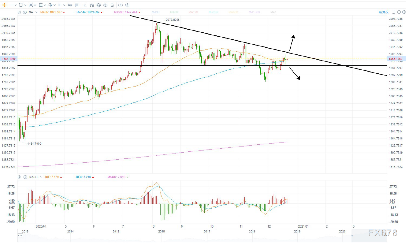 日线方面金价至2075以来的调整持续了4个月,目前下降通道压力在1920附近,如果突破并且站上1920,则价格很有可能攻击前期密集成交区间1960附近,下方支撑1850是多空分水岭,如果跌破则二次探底,考虑到圣诞节前后都是涨多跌少,等待一次突破的机会。