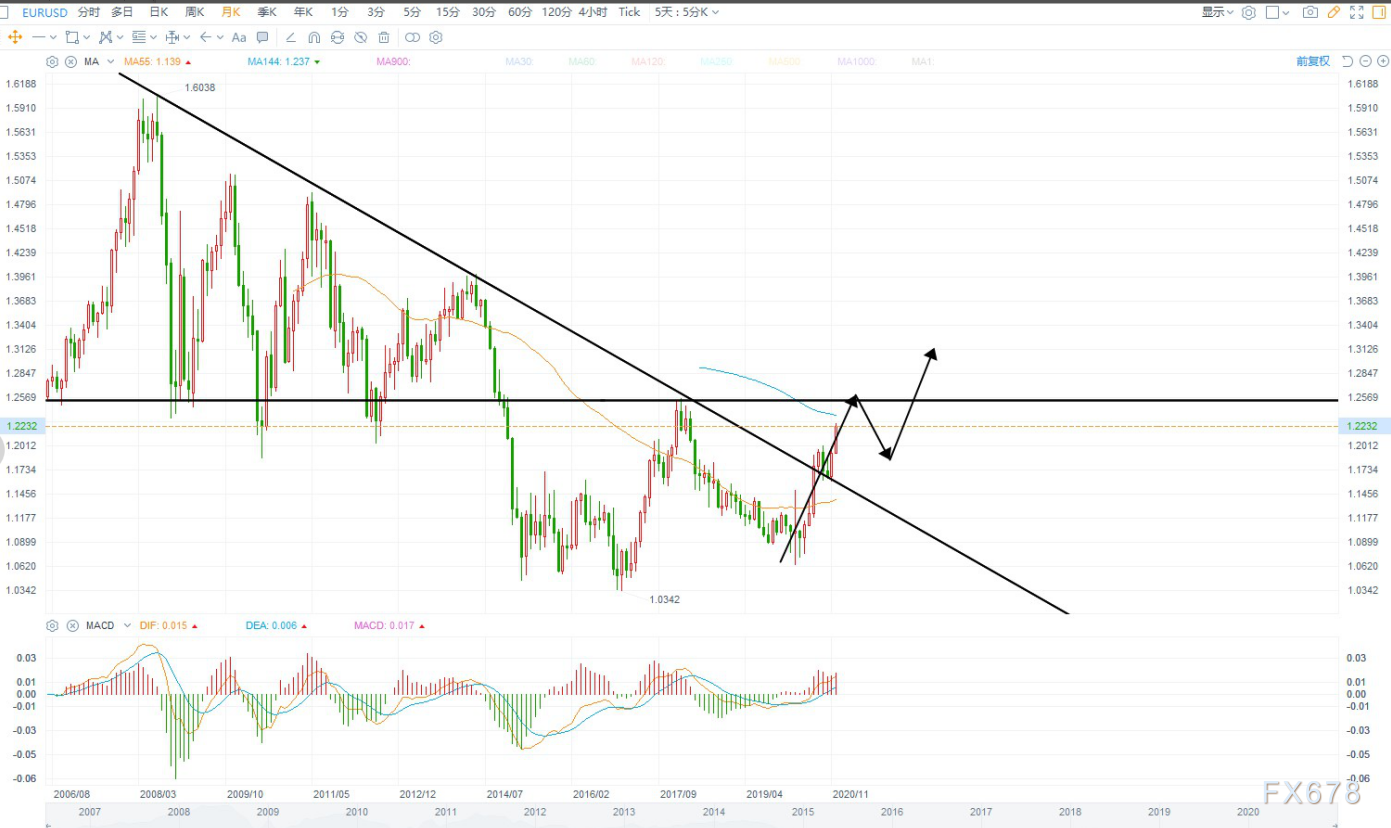 其次,欧美由于突破了月线级别的下降趋势线,已经来到2018年高点附近,如果美元继续走弱,则很有可能欧美向上突破,基本面上欧元区经济下行压力较大,且由于脱欧的影响一定程度上影响其经济增速,技术层面欧美月线突破位置1.1680连续调整4个月之后突破向上,明年主观方向等待突破1.2360附近压力,如果突破则打开上行空间,最次的走法也是1.2900至1.1750区间波动。